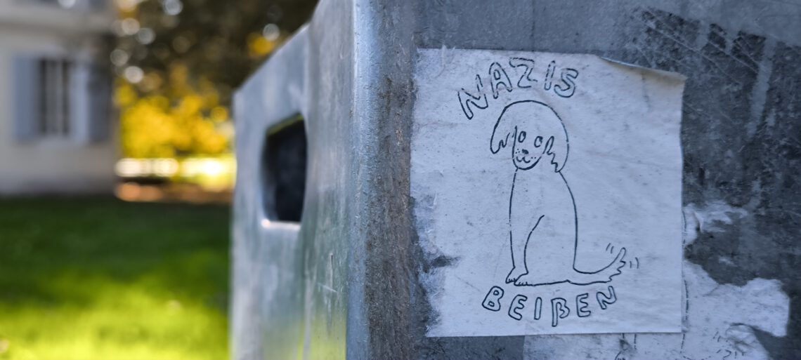 Aufkleber am Mülleimer neben der Bank rechts neben dem Billet’schen Schlösschen .